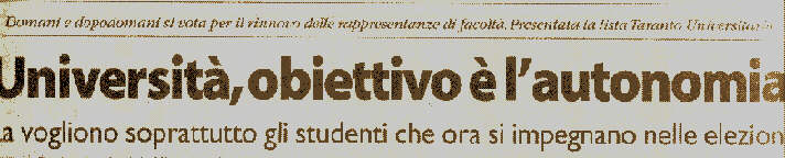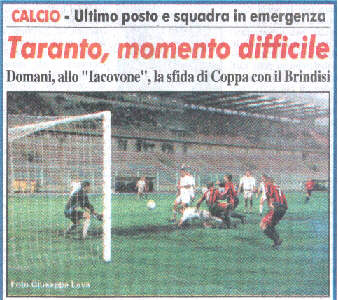 Solo ora ho avuto il tempo per leggere gli articoli della stampa tarantina e finalmente guardare il filmato del servizio di Studio 100. Per caso, qualcuno ha anche quello di Blustar? Vorrei confrontarli anche perchè, si sa, Studio 100 è un po' di parte ... e poi l'intervistatrice non accocchia neanche 2 centesimi! Ovviamente parlo a titolo personale e mi assumo tutta la responsabilità di ciò che scrivo ...