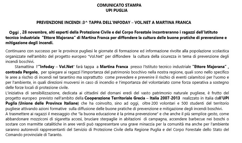 PREVENZIONE INCENDI:3^ TAPPA DELL’INFODAY – VOL.NET A MARTINA FRANCA