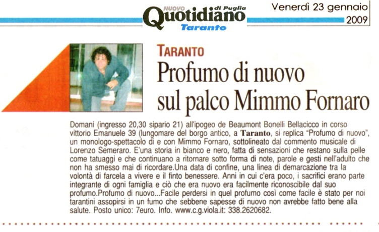 ... dopo aver ammirato e goduto lo straordinario 'a solo' di Mimmo Fornaro nel suo 'Profumo di nuovo' che tanti di noi (beh, soprattutto quelli dalla " ...antina" in sù), ieri sera, ha anche emotivamente trascinati in una rivisitazione molto coinvolgente in cui ritrovare momenti ed aspetti non individuali ma di popolo, ospiti nel consueto incantevole scenario dell'Ipogeo, amiche ed amici carissimi, vicini, lontani, lontanissimi ma tutti con Taranto nel cuore, auguri (grazie infinite a Biagio :-)) a Lucky, Alessia e soprattutto (in sciagurato ritardo - scusepperdòno Francè, lo sai siamo come trottole e qualcosa sempre sfugge, alaaanghe .. -) al caro Superfranco, sperando che per loro e per tutti sia una domenica speciale. E allora un regalino 'speciale' lo vogliamo fare subito, ai festeggiati, a tutti voi, e pure a noi, grazie a un bellissimo e graditissimo contributo di Maurizia