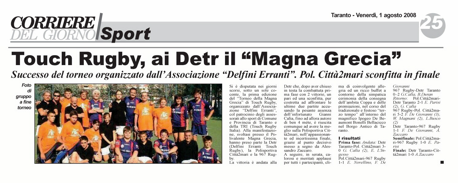 Commento: BUOOONGIORNO delfini e delfine,sorella e fratelli sabato a lavoro mentre altri sono stesi sulla spiaggia come sarà tra una settimana dove a fine partita tutti cadranno stesi sulla spiaggia.stavo studiando di fare una nostra haka tarantina prima di ogni partita. u cavad'm'fac'nù brutt'effett'.comunque buon sabato e ni raccomando non vi atteggiate che la vostra foto è uscita sul giornale ma fate ancora peggio.io spero di firmare qualche autografo,secondo mè sò cambial,acciarini p.s.a dà passà agost' |