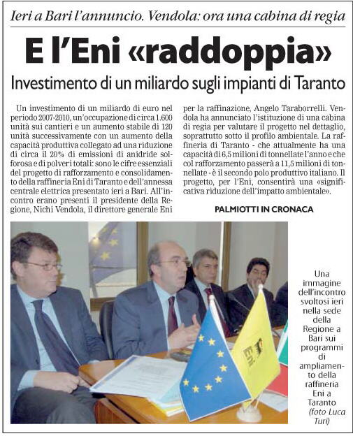 Completamente differente è stato l'esito processuale per l'amministratore delegato ed il direttore dell'AGIP, i dottori Moroni ed Elefante. Preso atto di quanto emerso dalla lunga istruttoria dibattimentale (che, ricordiamo, ha fatto registrare anche le testimonianze dell'ex sindaco di Taranto, Rossana Di Bello, e del presidente della Provincia, Gianni Florido), nei confronti degli imputati il giudice ha ritenuto prescritto il reato di “getto pericoloso di cose”, mentre per quanto concerne l'accusa di danneggiamento e di mancato rispetto dei valori di emissione di polveri totali sospese è stata decretata l'assoluzione, rispettivamente, perchè il fatto non sussiste e per non aver commesso il fatto. Altre due decisioni caratterizzanti un verdetto che ha riconosciuto il diritto delle parti civili (la UIL provinciale e “Legambiente”) al risarcimento di danni la cui entità verrà stabilita nel corso di un distinto procedimento.