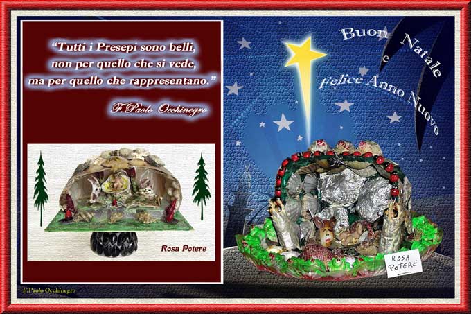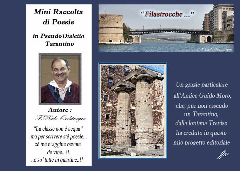 Invio gli Auguri di Buone Festività a Voi tutti e la copertina ant. e post. della mia raccolta di filastrocche ... Fra qualche giorno dovrebbero arrivarmi i libretti. Per gli eventuali interessati, appena possibile comunicherò le notizie relative all'acquisizione. Ci sono 26 pagine con altrettante poesiole pepate ..., in pseudo-dialetto tarantino, corredate da mie foto in tema. Se ne sconsiglia la lettura ai politici di tutte le parti ... Ciao e a presto, Paolo.