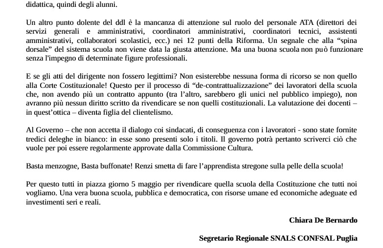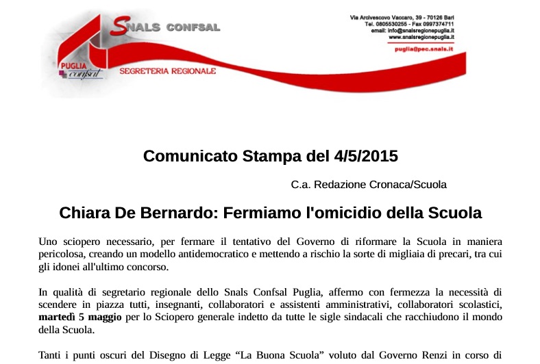 Chiara De Bernardo (Snals, Confsal Puglia), sullo Sciopero generale della Scuola (domani 5 maggio)