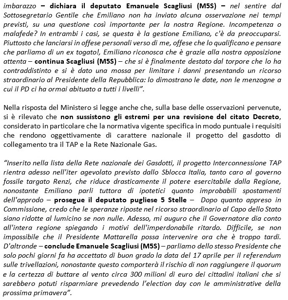 - Scagliusi: Emiliano dia spiegazioni su interconessione TAP - M5S Bari: chieste strisce degli stalli anche per mercato via Nizza