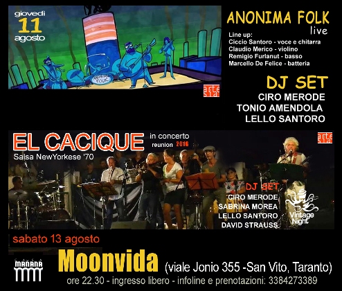 Giovedì 11: "Anonima Folk" in concerto, vincitori nel 2004 del prestigioso Premio Nazionale "Fabrizio De Andrè", dopo il quale, la band, inizia un importante tour per tutta la penisola che la porta in giro per le piazze ed i festival d'Italia. Line up : Ciccio Santoro - voce e chitarra, Claudio Merico – violino, Remigio Furlanut – basso e Marcello De Felice – batteria. Al termine del concerto la serata prosegue con il dj set di Ciro Merode, Tonio Amendola e Lello Santoro. Sabato 13: El Cacique in concerto (salsa NewYorkese '70), storica formazione pugliese con tantissimi concerti all’attivo per tutta l’Italia. La band: Gianni Losasso - voce e trombone, Marcello Losasso - voce e percussioni, Pina Castiglia - congas, Pino Magaldi - chitarra e cori, Aldo Scatigna - flauto, tromba e cori, Piero Monopoli - sax tenore e cori Roberto Andrisani - contrabasso, Daniele Pignatelli - pianoforte, Piero Cosa - voce e percussioni, Giovanni Delcore - bongo e cori, Massimo Negro - timbales, Angelo Losasso - batteria e cori e Mario Peruggini - produzione audio. Dopo il concerto, Vintage Night, dj set con Ciro Merode, Sabrina Morea, Lello Santoro e David Strauss. In entrambe le serate l'ingresso è gratuito - Info e prenotazioni: 345.5103322 - 3384273389. Direzione artistica : Artesia – Servizi per l'Arte e lo Spettacolo.