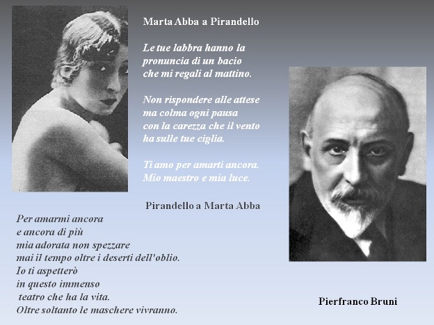 Luigi Pirandello e Marta Abba. Un racconto tra storia, amore, lettere, immagini. Pierfranco Bruni ha ricostruito, per il suo studio su Luigi Pirandello a 150 anni dalla nascita, un immaginario – finzione, attraverso versi e immagini, il loro legame. Si tratta di un dialogare tra la fantasia e le interpretazioni che Pierfranco Bruni ha cercato di ricostruire con un percorso in cui la fantasia prende il soppravvento. Servendosi della sua esperienza e del suo modello lirico Pierfranco Bruni ha scritto i versi mentre il montaggio delle immagini è di Anna Montella e di Stefania Romito che hanno impaginato il viaggio che Bruni fa compiere a Luigi e a Marta con una singolare oniricità e originalità. Pierfranco Bruni è autore di un recente libro – racconto dal titolo “Luigi Pirandello. Il tragico e la follia” (Nemapress) e un nuovo libro dal titolo “Pirandello per labirinti e caos” verrà pubblicato nei prossimi mesi. Questo viaggio per volti e parole tra l’incontro di Luigi e Marta rappresenta una vera e propria mostra online, che permette di dare un senso sia alla finzione letteraria che ad un ricostruzione che soltanto uno scrittore come Pierfranco Bruni poteva realizzare. La Mostra online: “Marta e Luigi. La finzione e la realtà nell’immaginario” propone, comunque, un via per approfondire il loro legame grazie alla lettura delle lettere dello scrittore e dell’attrice e comprendere quel “Tu sei la mia musa” di Pirandello. Bruni è partito proprio da questo concetto e con molta eleganza ha lavorato usando gli strumenti della fantasia basata sulla lettura della loro corrispondenza.