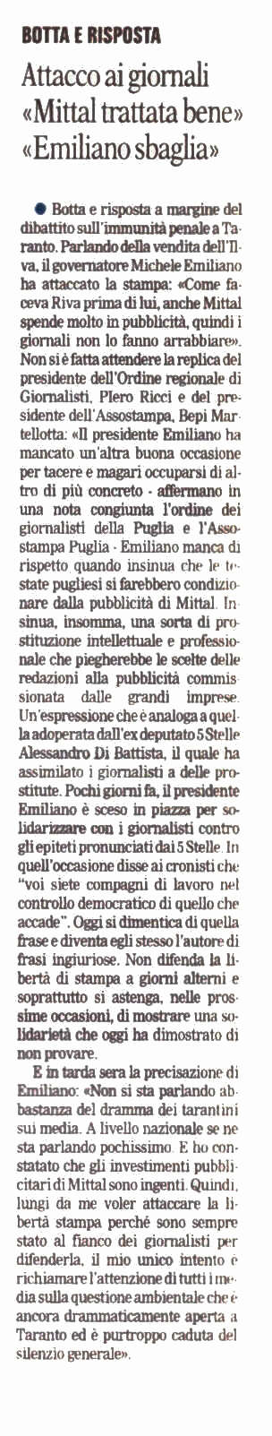 Siderurgico: l'immunitĂ penale, barbarie giuridica! La Procura porti il caso alla Corte Costituzionale