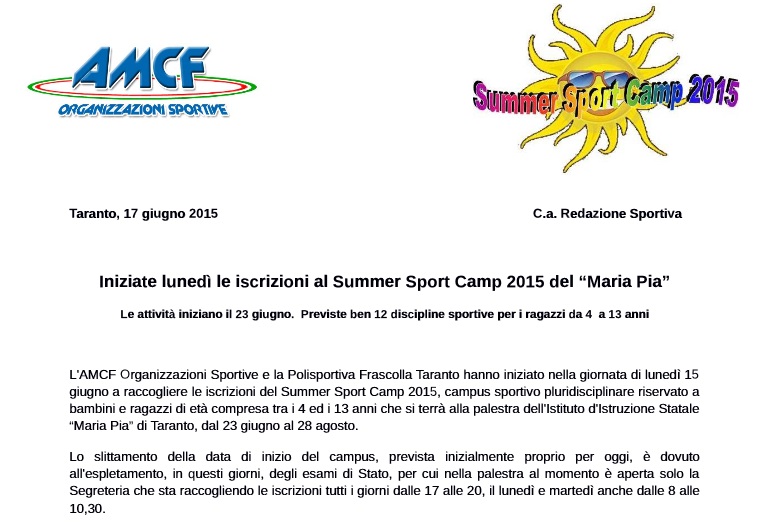 AMCF - Iniziate lunedì le iscrizioni al Summer Sport Camp 2015 del “Maria Pia”