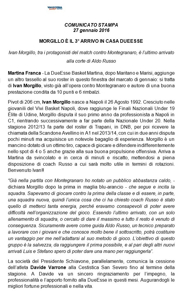 giovedì 28 gennaio 2016 da uff. Stampa DueEsse Basket Martina ![]() ![]() Morgillo Ufficio Stampa DueEsse Basket Martina Dott.ssa Veronica Fumarola Dott. Andrea Semeraro Andrea Lafornara Mail: stampa.martinabasket@gmail.com Sito internet : www.valleditriabasket.it Indirizzo Facebook: www.facebook.com/valleditriabasket Indirizzo Instagram: www.instagram.com/valleditriabasket |