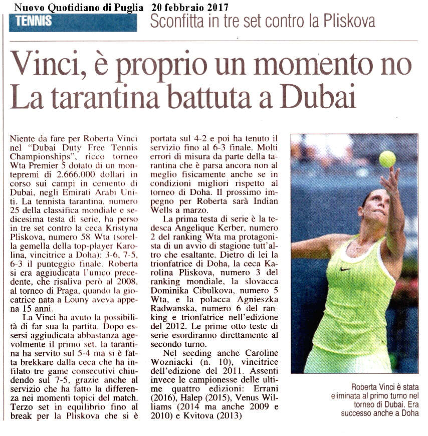 Tennis - Ancora un KO per la Vinci, subito fuori anche a Dubai