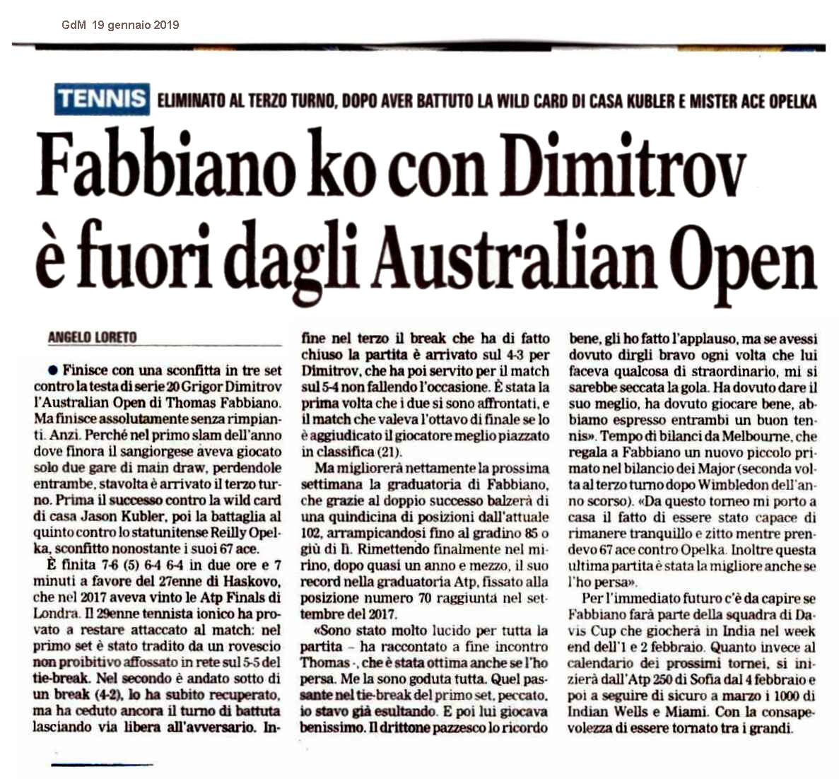 Tennis - Fabbiano out in Australia