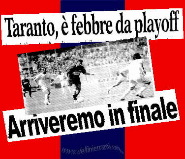 In tante occasioni uno pazienta ed abbozza, se ne fa una ragione e si mette l'anima in pace e rinuncia, però qua si tratta della serie B ca ne l'ame scurdate (chi l'ha vista) com'è fatte. Perciò mò per favore fateci vedere almeno i playoff. O manghe quiste? Grazie per l'attenzione. E Forza grande Taranto! P.S. scusate se ci ripetiamo ma è importante: TIFO A FAVORE! TIFO A FAVORE! TIFO A FAVORE! Grazie.